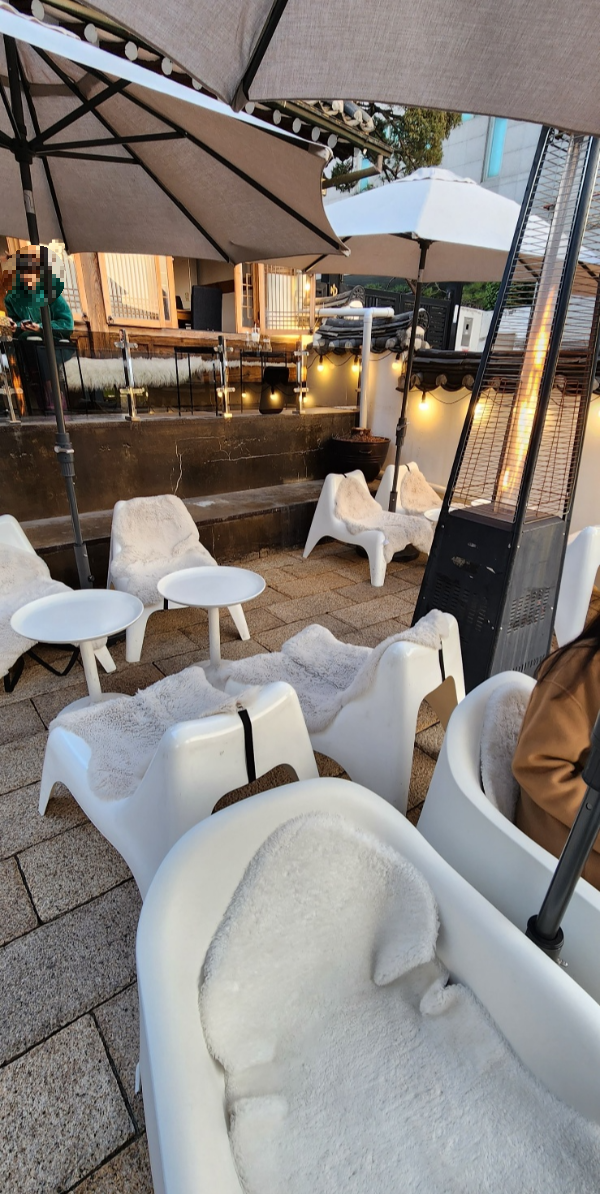 야외에는 도로 쪽인 정면을 바라보고 앉을 수 있는 테라스 자리가 있는데 뷰가 좋다기 보단 맞은편에 한옥 건물이나 지나다니는 차와 사람들을 구경하기에 좋았습니다.