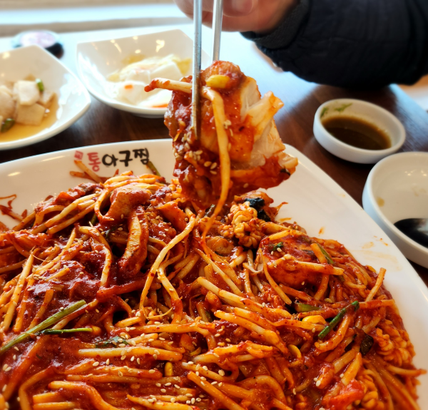 맛있게 조리된 아구찜이 나왔습니다! 비쥬얼부터 너무 먹음직스럽습니다.
