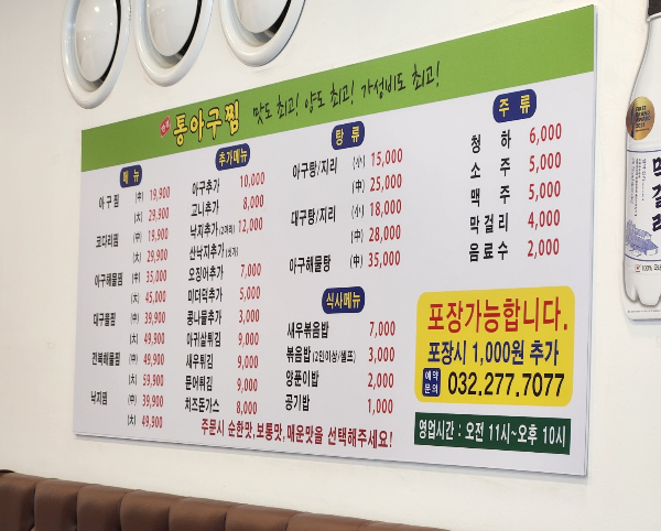 거기다 아구찜뿐만 아니라 각종 해물 찜이나 탕도 있고 매운걸 못 먹는 아이들이 먹기 좋은 볶음밥이나 돈가스까지 메뉴 다양하고 추가할 수 있는 메뉴도 많아서 좋았습니다.