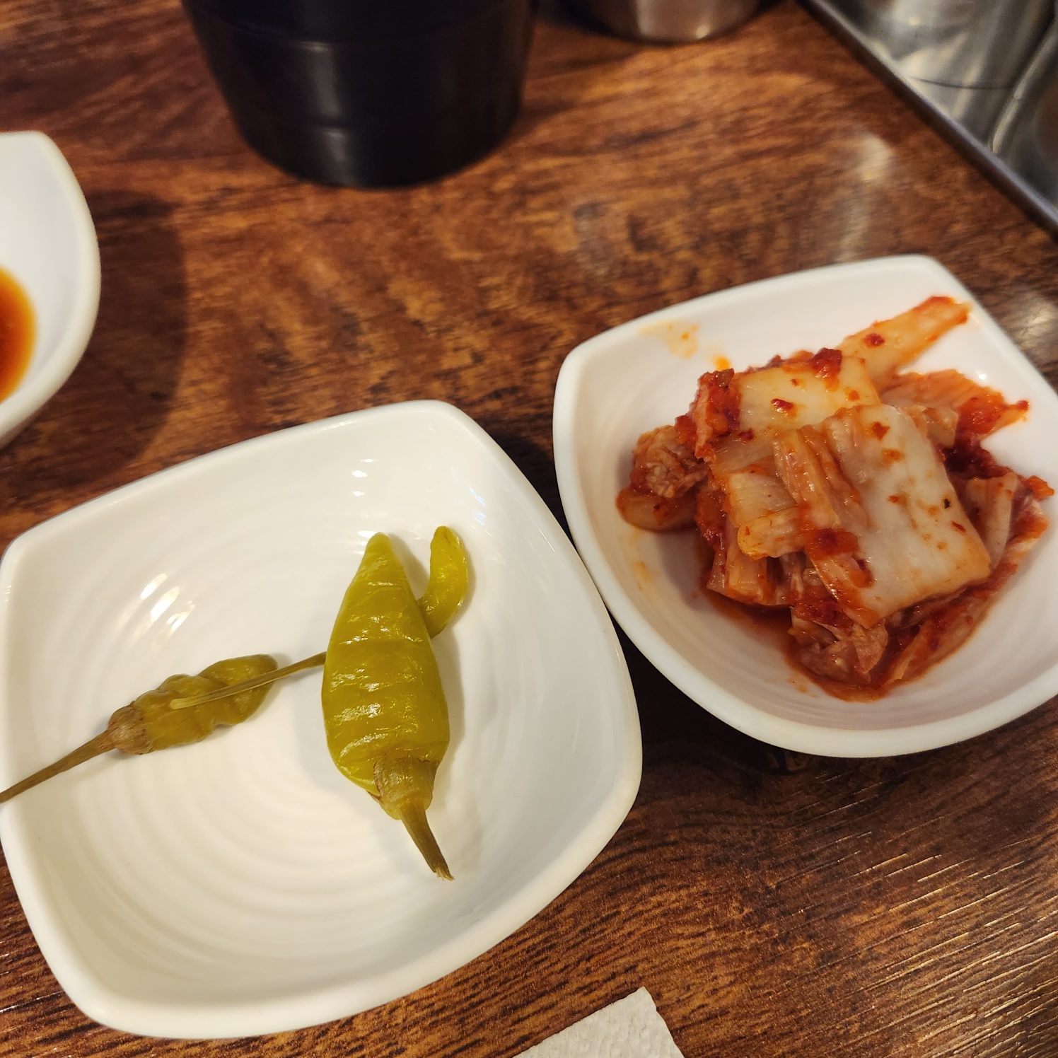 밑반찬으로는 김치와 고추장아찌가 나와요.
